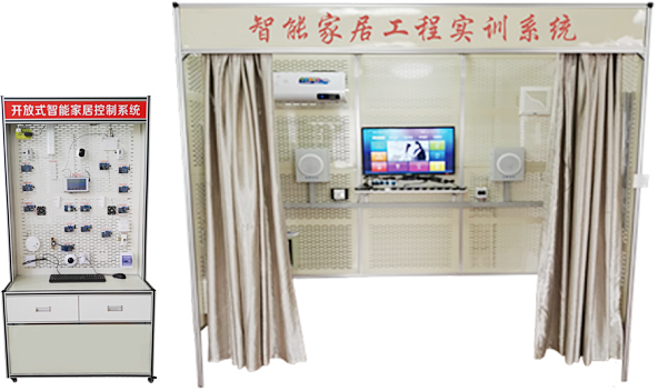 智能家居網(wǎng)板實訓系統(tǒng)主要由環(huán)境感知設備、安防門禁設備、控制設備、視頻監(jiān)控設備、智能網(wǎng)關、智能終端、以及鋁合金鋼架結(jié)構(gòu)組成。