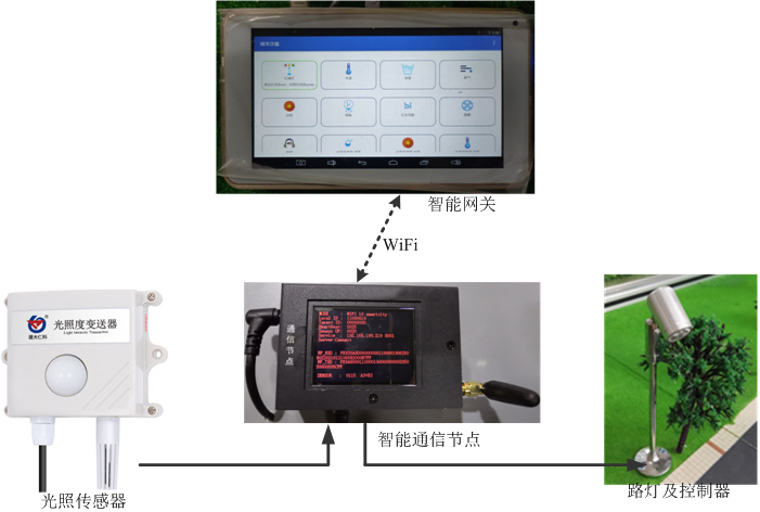 (1)路燈控制系統(tǒng):由智能通信節(jié)點及外圍驅(qū)動電路板、路燈、光照傳感器組成。智能通信節(jié)點實時采集光照度,通過無線通信方式傳輸至網(wǎng)關(guān)。結(jié)合網(wǎng)關(guān)應用程序,可以實現(xiàn)路燈開關(guān)控制、環(huán)境光照度定時采集,設置光照傳感器與路燈控制器的聯(lián)動策略,根據(jù)光照強度,自動控制路燈開關(guān);同時將光照度數(shù)據(jù)、路燈開關(guān)狀態(tài)上傳到云平臺進行可視化展示,遠程路燈控制。