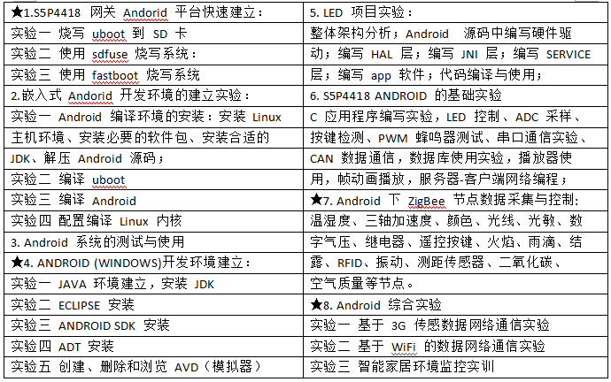 7、基于 WiFi/BT 的網(wǎng)絡(luò)通信開發(fā):可以開展 WiFi/BT 通信原理、WiFi/BT 模塊驅(qū)動開發(fā)、WiFi/BT 模塊原理設(shè)計(jì)、WiFi/BT 互聯(lián)網(wǎng)接入、WiFi/BT 移動通信與物聯(lián)網(wǎng)應(yīng)用開發(fā)等。