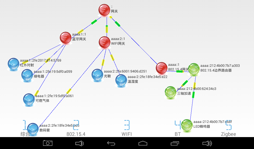 網(wǎng)關(guān)應(yīng)用軟件通過CoAP服務(wù)和串口服務(wù),將WiFi、藍(lán)牙、IEEE802.15.4、以及ZigBee感控節(jié)點(diǎn)數(shù)據(jù)解析處理,在網(wǎng)關(guān)的Mesh拓?fù)鋱D中實(shí)時(shí)流動(dòng)地顯示傳感器數(shù)據(jù)的上、下行走向;