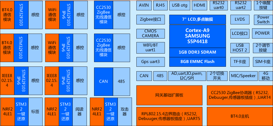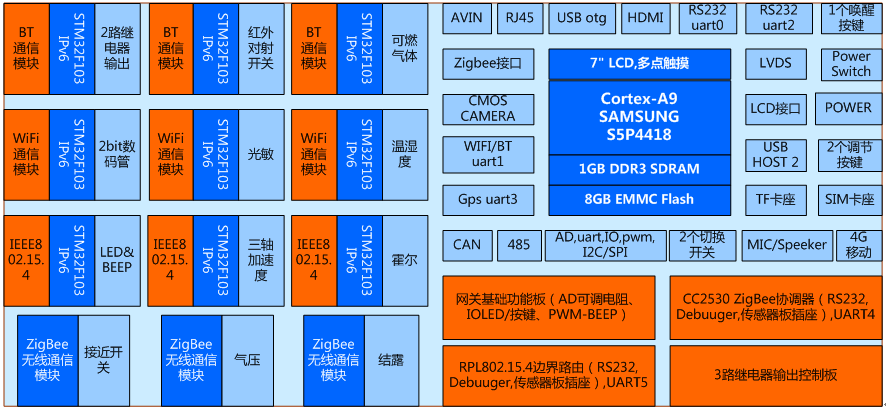 一、整體要求 1)能夠滿足單片機(jī)接口及應(yīng)用、傳感器接口及應(yīng)用、無線傳感網(wǎng)、嵌入式操作系統(tǒng)開發(fā)、嵌入式Linux應(yīng)用開發(fā)、Android移動(dòng)應(yīng)用開發(fā)等課程要求。 2)能夠組建藍(lán)牙、WiFi、IEEE802.15.4、ZigBee四種無線網(wǎng)絡(luò),實(shí)現(xiàn)數(shù)據(jù)的無線傳輸; 3)能夠?qū)⑺{(lán)牙、WiFi、IEEE802.15.4無線網(wǎng)絡(luò)經(jīng)IPV6協(xié)議、Zigbee節(jié)點(diǎn)經(jīng)ZStack協(xié)議融合在一個(gè)拓?fù)鋱D中,在界面上顯示藍(lán)牙、WiFi、RPL802.15.4、ZigBee等節(jié)點(diǎn)的傳感器數(shù)據(jù)或執(zhí)行器狀態(tài),并實(shí)時(shí)流動(dòng)地顯示各個(gè)傳感器數(shù)據(jù)的上、下行走向; 4)要求藍(lán)牙、WiFi、IEEE802.15.4三種傳感器節(jié)點(diǎn)均具有唯一的IPv6地址,統(tǒng)一采用IPv6協(xié)議組包通信。 5)要求網(wǎng)關(guān)支持Linux、Android雙操作系統(tǒng),支持一鍵燒寫、一鍵切換。 6)要求在保證網(wǎng)關(guān)接入互聯(lián)網(wǎng)的前提下,能夠配置接入云服務(wù)平臺(tái),并實(shí)現(xiàn)移動(dòng)端傳感器數(shù)據(jù)的采集顯示和執(zhí)行器的遠(yuǎn)程控制。 二、硬件資源 1.Cortex-A9網(wǎng)關(guān)(1個(gè)) 1)核心板資源: (1)CPU:Cortex-A9四核心的Samsung s5p4418,主頻1.4GHz; (2)GPU:MAIL-400,3D圖形加速 (3)內(nèi)存: 1GB DDR3; (4)EMMC: 8GB; (5)核心板+底板設(shè)計(jì):核心板加裝屏蔽罩,郵票孔方式與底板連接,抗干擾能力更強(qiáng),比插針式更穩(wěn)定可靠。要求引出核心板信號(hào)線,不少于188PIN。 2)網(wǎng)關(guān)主板資源: (1)LCD接口:7寸IPS電容屏(16:9),分辨率1024×600; (2)USB接口:2路USB_HOST 2.0輸出,1路USB OTG; (3)Ethernet接口:核心板內(nèi)置千兆IP,外加不超過3RMB的PHY芯片即可,支持10/100/1000M,RJ45接口; (4) 串口:2路3線RS232,1路TTL接口,1路RS485,1路Bluetooth; (5)CAN總線接口:1路; (6)RS485總線接口:1路; (7)HDMI 接口:HDMI1.4a,*大支持1920*1080高清數(shù)字輸出; (8)LVDS液晶屏接口:單通道,*大支持1920*1080; (9)攝像頭接口:1路CMOS并行接口,*大支持800萬像素; (10)AV接口:1路模擬視頻母口輸入; (11)外部存儲(chǔ)擴(kuò)展接口:SD卡、TF卡接口; (12)音頻接口: 1路MIC輸入,1路1. 8w喇叭; (13)按鍵:1個(gè)復(fù)位按鍵、1個(gè)休眠喚醒按鍵,2個(gè)音量鍵; (14) 藍(lán)牙WiFi:板載藍(lán)牙WiFi二合一模塊; (15)Mini PCIe接口:標(biāo)準(zhǔn)可插入4G通信模模塊; (16)24Pins應(yīng)用擴(kuò)展接口:用于處理器外設(shè)接口擴(kuò)展功能,包含3路串口、1路PWM、1路IIC、1路ADC、8個(gè)GPIO,5V電源。 2.網(wǎng)關(guān)IO基礎(chǔ)擴(kuò)展板(1個(gè)) 由網(wǎng)關(guān)直接驅(qū)動(dòng)。采用HC595串入并出特點(diǎn),使用較少IO擴(kuò)展更多功能,默認(rèn)地址0x01。1路可調(diào)電位器模擬AD采樣通道,1路PWM驅(qū)動(dòng)的蜂鳴器,5個(gè)觸摸按鍵,5個(gè)LED指示燈。 3.三路繼電器擴(kuò)展板(1個(gè)) 由網(wǎng)關(guān)直接驅(qū)動(dòng)。采用HC595串入并出特點(diǎn),使用較少IO擴(kuò)展更多功能,默認(rèn)地址0x10。 可控制3路繼電器,線圈機(jī)械式觸點(diǎn),1個(gè)常開,1個(gè)常閉,*大負(fù)載10A/277V AC。 4. ZigBee協(xié)調(diào)器(1個(gè)) 與網(wǎng)關(guān)的TTL UART連接。采用CC2530單片機(jī)外設(shè)接口、射頻通信與ZStack協(xié)議棧的方案,具備Zigbee建網(wǎng)功能,具有2個(gè)組網(wǎng)狀態(tài)及無線傳輸指示燈,2個(gè)功能按鍵,提供傳感器模塊接口、RS232接口、調(diào)試下載接口。 5. IEEE802.15.4主機(jī)(1個(gè)) 與網(wǎng)關(guān)的TTL UART連接。采用CC2530射頻功能與802.15.4的從機(jī)組建射頻網(wǎng)絡(luò),接收從機(jī)信息,向從機(jī)發(fā)送命令。具有2個(gè)組網(wǎng)狀態(tài)及無線傳輸指示燈,2個(gè)功能按鍵,提供傳感器模塊接口、RS232接口、調(diào)試下載接口。 6.無線傳感網(wǎng)通信節(jié)點(diǎn)(12個(gè)) 1)微控制器主板硬件資源 (1)Cortex-M3核心主板(9個(gè)) 處理器基于ARM Cortex-M3核心的STM32F103,*高主頻72Mhz,內(nèi)部Flash 256KB,RAM 48KB。 具有1個(gè)0.96寸OLED屏,能夠顯示MAC地址、上下級(jí)關(guān)系、傳感器數(shù)據(jù)、網(wǎng)絡(luò)信息等。 具有4個(gè)組網(wǎng)狀態(tài)及無線傳輸指示燈,2個(gè)功能按鍵、1個(gè)JTAG調(diào)試接口、1個(gè)24PIN的無線射頻接口,1組20*2PIN傳感器接口; 標(biāo)配ARM仿真器、串口下載仿真調(diào)試轉(zhuǎn)接板。 運(yùn)行IPv6協(xié)議棧實(shí)現(xiàn)無線通信的功能。 (2)CC2530核心主板(3個(gè)) 處理器基于CC2530F256,具有2個(gè)組網(wǎng)狀態(tài)及無線傳輸指示燈,2個(gè)功能按鍵、1個(gè)JTAG調(diào)試接口、1個(gè)24PIN的無線射頻接口,1組20*2PIN傳感器接口; 標(biāo)配下載仿真器。 2)無線傳感網(wǎng)通信模塊 (1)藍(lán)牙通信模塊(3個(gè)):采用UART接口的內(nèi)置協(xié)議棧方案,設(shè)置從機(jī)模式,與主機(jī)配對(duì)后,將微控制器采樣數(shù)據(jù)傳輸給主機(jī)。 (2)WiFi通信模塊(3個(gè)):采用UART接口的內(nèi)置TCP/UDP/HTTP協(xié)議棧方案,支持設(shè)置為AP、STA的工作模式,與網(wǎng)關(guān)通信后,將微控制器采樣數(shù)據(jù)傳送給主機(jī),或者接收主機(jī)的控制命令控制執(zhí)行器。 (3)IEEE802.15.4通信模塊(3個(gè)):基于CC2530射頻組網(wǎng)通信方案,與邊界路由器組網(wǎng),實(shí)現(xiàn)傳感器數(sh