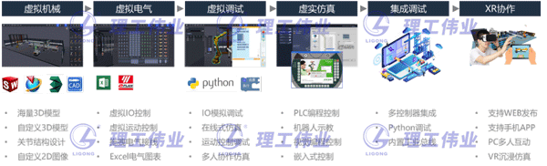 IMT數(shù)字孿生系統(tǒng)能夠從虛擬機械設(shè)計、虛擬電氣接線再到虛實互動編程,虛擬調(diào)試以及集成調(diào)試的整個過程,同時配置XR互動仿真,能夠?qū)崿F(xiàn)多人協(xié)作的沉浸式應(yīng)用,IMT系統(tǒng)具有多種仿真和組合方式,支持半實物、全虛擬、以及3D互動的編程方式。