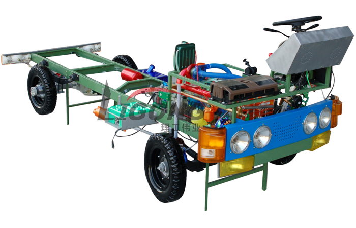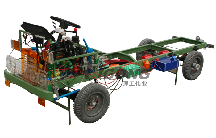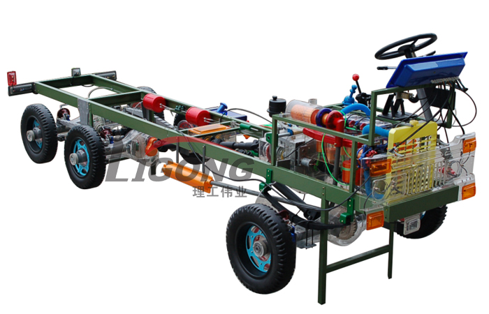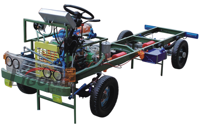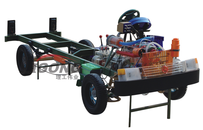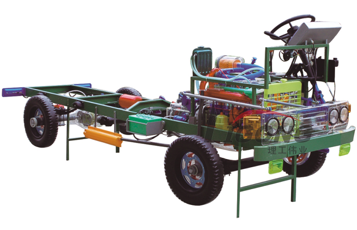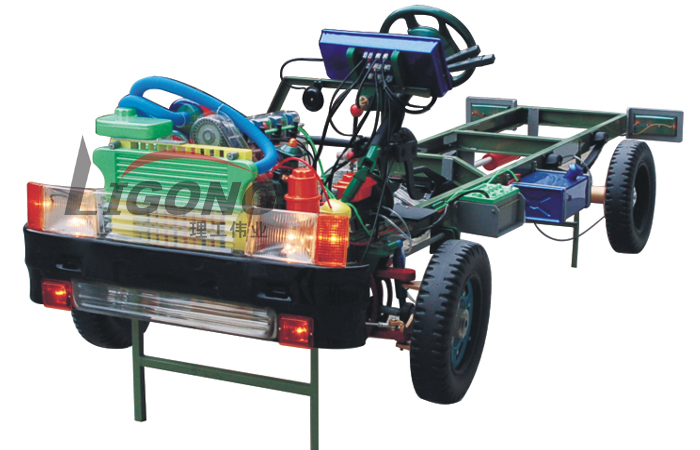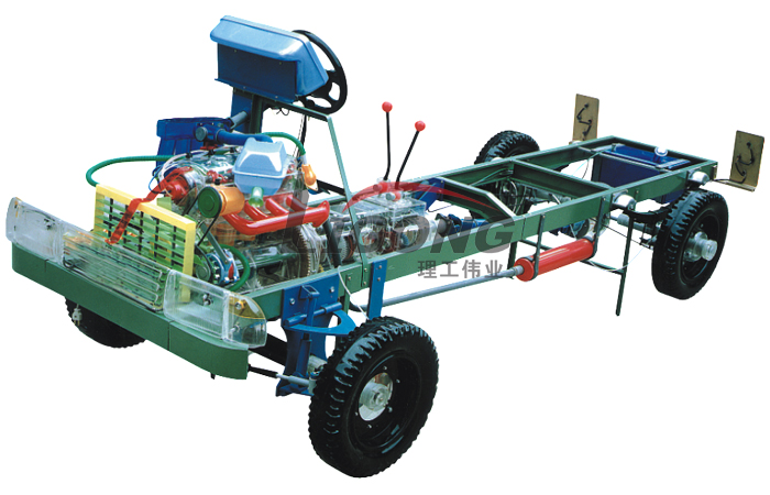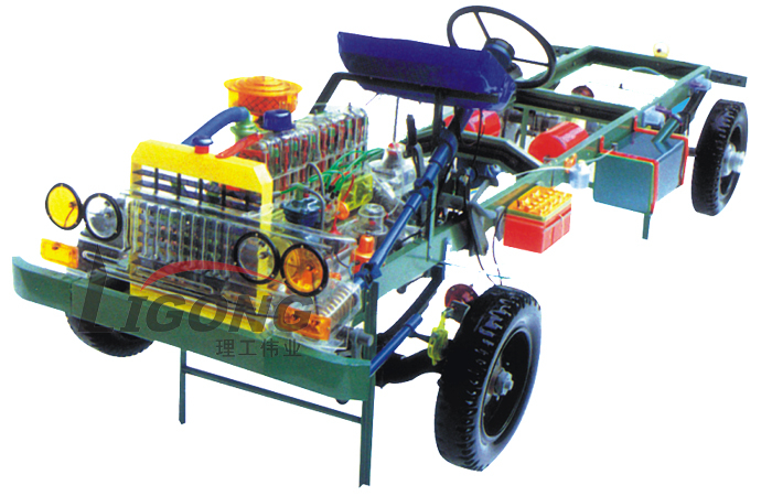 本品選用透明有機玻璃制作,內(nèi)中部件均以硬質(zhì)塑料料加工,用 螺絲固定在金屬高溫烘漆而成的車架上。各總成部分都以壓模成形加 工,代替過去膠粘合的方法,使產(chǎn)品在強度上有很大提高。發(fā)動機總成用電機驅(qū)動,在油門處設有調(diào)速裝置,能演示發(fā)動機轉(zhuǎn)速高低。離合器分離明顯,操縱靈活,離合器外殼整體壓模而成,變速箱和各檔齒輪用各種顏色表示,換檔靈活,手制動美觀。后橋外形壓模而成,內(nèi)中主減速、差速轉(zhuǎn)動自如,輪轂剎蹄壓模成型,剎蹄可調(diào)節(jié),前橋輪鼓可調(diào)整,轉(zhuǎn)向裝置以及電瓶、油箱、水箱,制動管路分布清楚一目了然。電路采用對插件前后分布,燈架、風窗、儀表板、后燈架用透明有機玻璃壓模成整體美觀逼真。