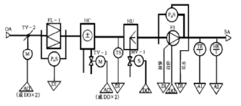 新風機組采用集中控制,本方案采用DDC直接數(shù)字控制。新風機組DDC控制系統(tǒng)原理如圖3所示,為新風機組的直接數(shù)字控制(DDC)系統(tǒng)流程圖。其溫度控制系統(tǒng)由溫度傳感器TE、執(zhí)行器電動兩通調(diào)節(jié)閥TV-1及換熱器和新風閥TV-2組成。濕度控制系統(tǒng)由濕度傳感器ME1、加濕電動兩通調(diào)節(jié)閥TVS、加濕器組成。過濾器報警及風機運行狀態(tài)和故障狀態(tài)監(jiān)視系統(tǒng)由過濾器壓差開關(guān)PdS、防凍開關(guān)TS、風機過流繼電器常開觸頭(事故報警)、風機前后的壓差開關(guān)的常開觸點(狀態(tài)監(jiān)視)及DDC輸出繼電器模塊組成。