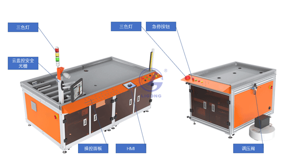 設(shè)備架體用于支持各單元,上臺面為型材臺面,各單元可方便在臺面安裝。具有腳輪,可用于移動設(shè)備。上面安裝有云監(jiān)控安全光柵、三色燈,另一臺架控制面板上也具有三色燈,用于顯示協(xié)作機器人運行狀態(tài)??刂泼姘灏惭b有急停開關(guān),可在緊急情況下快速停止設(shè)備。架體前方可開門,可放置工具、行星裝配模塊、2D軌跡訓(xùn)練單元、3D軌跡訓(xùn)練單元等物品。如圖所示。