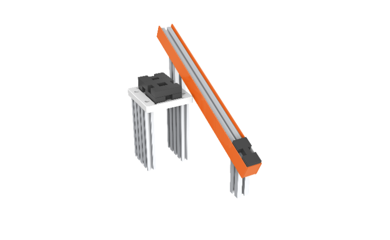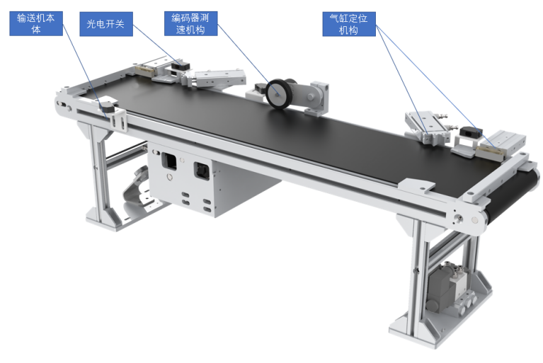 皮帶輸送單元是設(shè)備的重要組成部分,負責(zé)接駁CPU托盤的運輸,包括輸送機本體、氣缸定位機構(gòu)、編碼器測速機構(gòu)、光電開關(guān)等組件構(gòu)成,如圖所示。芯片托盤在兩端位置可以用氣缸定位機構(gòu)定位,方便機器人精準上料,編碼器可以實時測得皮帶線速度,以結(jié)合機器人和視覺相機進行動態(tài)抓取及物料識別。側(cè)面具有光電開關(guān),可檢測芯片托盤位置。如圖所示