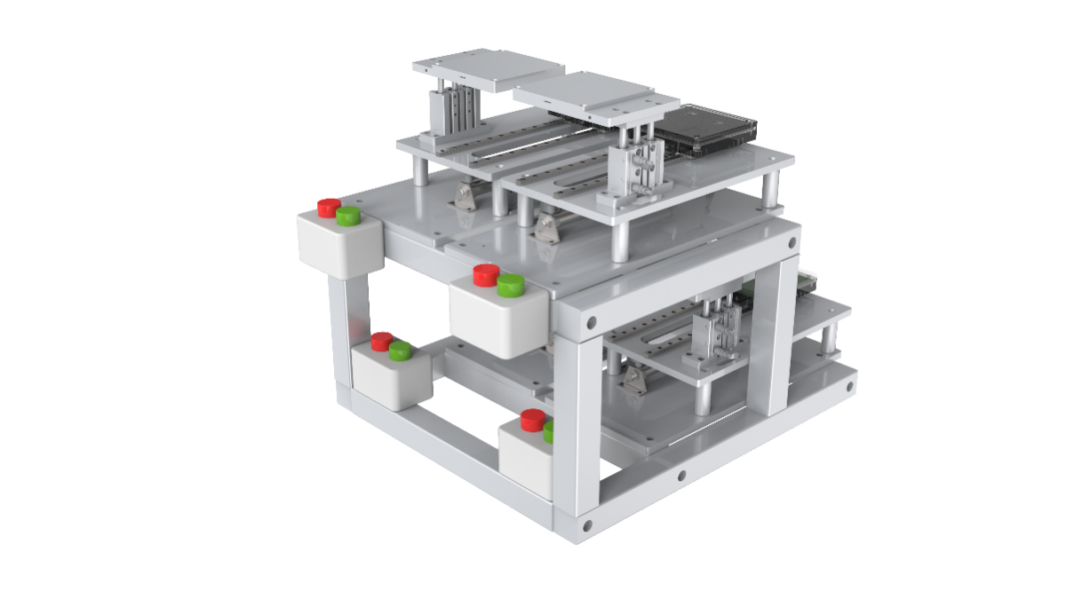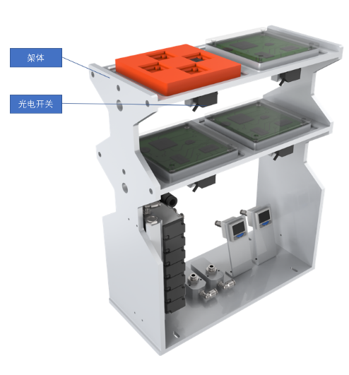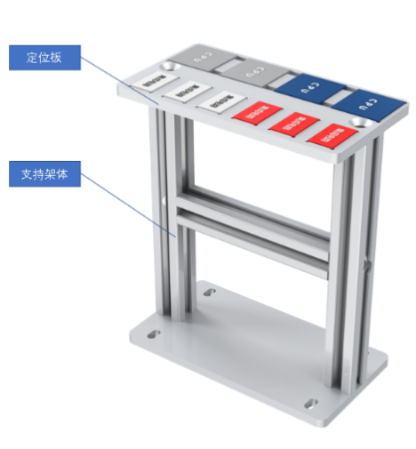緩存單元是機器人將分揀后的芯片放入定位板內(nèi);可以根據(jù)需求設(shè)定,讓機器人取揀選不同的芯片放至對應(yīng)的槽位。由支撐架體、定位板等組成。如圖所示。