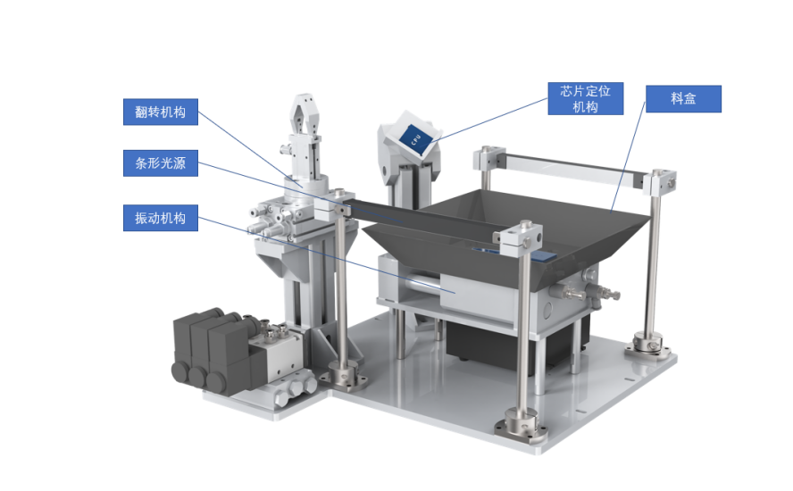 芯片供料單元由料盒、翻轉(zhuǎn)機構(gòu)、芯片定位機構(gòu)、條形光源等組成。芯片可以在翻轉(zhuǎn)機構(gòu)上進行正反方向改變,料盒振動功能,由氣缸伸縮實現(xiàn)??蓪崿F(xiàn)芯片的重新排列。料盒兩側(cè)具有條形光源,可補償外部環(huán)境對于視覺的干擾。芯片定位機構(gòu)是利用芯片的自重可進行二次定位,以便于協(xié)作機器人精準取放。如圖所示