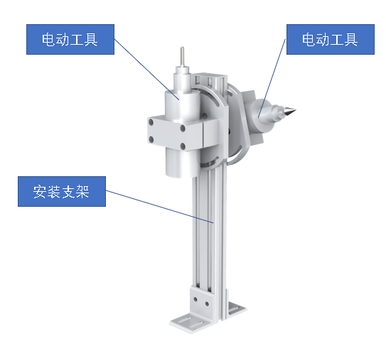 加工單元由安裝架體、銑刀電動工具、打磨電動工具等組成,可對零件表面進行銑削以及打磨,并且兩個工具都可以調(diào)整角度,方便與機器人進行角度配合。非常詳細的展示實際生產(chǎn)中這兩種不同的加工工藝,極大的加深了學(xué)生對兩種工藝理解和認知。如圖所示。