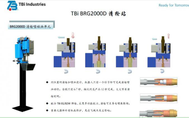 (2)德國TBi BRG-2000D清槍剪絲機(jī)構(gòu)清槍全程只需6-7秒,相比其它同類產(chǎn)品12秒完成,大大節(jié)約的機(jī)器人清槍時(shí)間,更高的提高機(jī)器人的工作效率。