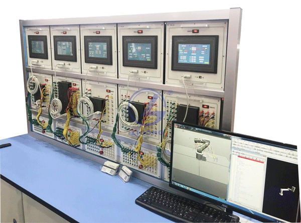 (4)配置與真實產(chǎn)線一致的PLC、人機界面,各6個站;西門子1200系列PLC6臺;昆侖通態(tài)TCP7032KT觸摸屏6臺;機器人示教器1套所有端口引出至面板的安全插座上,方便實驗連線。每個模塊安裝在掛箱上。