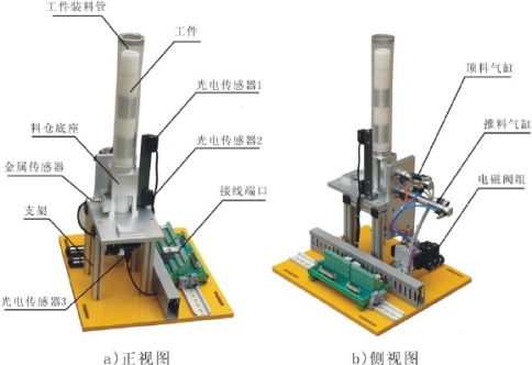 主要由井式工件庫、推料氣缸、物料臺、光電傳感器、磁性開關(guān)、電磁閥、支架、機械零部件構(gòu)成。 |