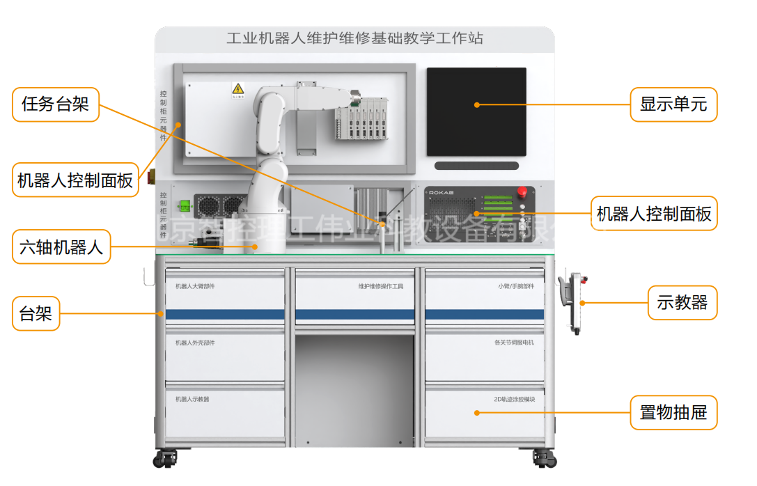 工業(yè)機(jī)器人維護(hù)維修基礎(chǔ)教學(xué)工作站,以工業(yè)機(jī)器人本體及其控制系統(tǒng)最常見(jiàn)維護(hù)維修操作為核心,通過(guò)對(duì)典型故障的診斷和排除,按照規(guī)范步驟完成對(duì)工業(yè)機(jī)器人本體的拆裝過(guò)程,并根據(jù)圖紙要求搭建控制系統(tǒng)并接線(xiàn),由零件級(jí)深入了解工業(yè)機(jī)器人的構(gòu)成形式和運(yùn)動(dòng)方式,掌握基礎(chǔ)維護(hù)維修技能。工作站配套了與生產(chǎn)廠家完全相同的工裝、工具,讓學(xué)生可以在教學(xué)環(huán)境中充分體驗(yàn)高精度機(jī)電設(shè)備的生產(chǎn)工藝要求,確實(shí)掌握維護(hù)維修技能。