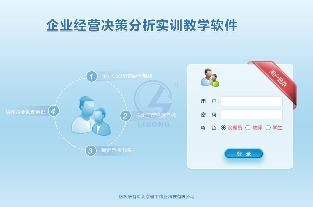《理工經(jīng)營決策分析實訓(xùn)軟件》件注重培養(yǎng)和提升學(xué)生企業(yè)管理意識,構(gòu)建虛擬的企業(yè)運營環(huán)境,讓學(xué)生體驗企業(yè)CEO制定經(jīng)營規(guī)劃、擬定年度經(jīng)營目標(biāo)、確定目標(biāo)市場、行業(yè)競爭等工作。