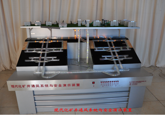 該現(xiàn)代化礦井通風(fēng)系統(tǒng)與安全實(shí)驗(yàn)裝置(適合于二、三、四級(jí)),由井上下兩部分構(gòu)成,地面示意現(xiàn)代化礦井的工業(yè)廣場(chǎng);井下采用光、電顯示并列式、分區(qū)式、對(duì)角式、中央邊界式等通風(fēng)方式及掘進(jìn)通風(fēng)、全礦井反風(fēng)、局部反風(fēng)等,并顯示出煤層注水,瓦斯抽放,均壓滅火等安全防預(yù)系統(tǒng)。