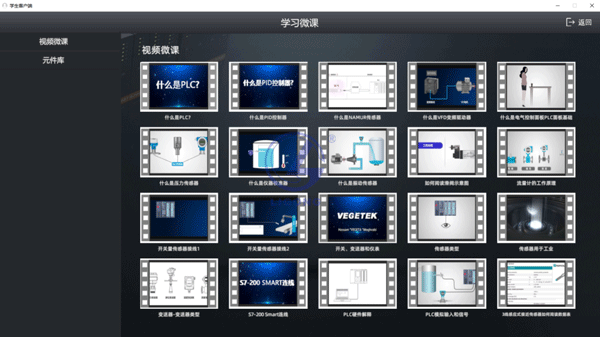 (3)微課學(xué)習(xí)包括視頻學(xué)習(xí)和元件庫兩個(gè)部分,視頻學(xué)習(xí)包括PLC相關(guān)的學(xué)習(xí)視頻20個(gè),元件庫包括PLC相關(guān)的電氣元件的三維模型。三維模型總數(shù)不少于20個(gè)。